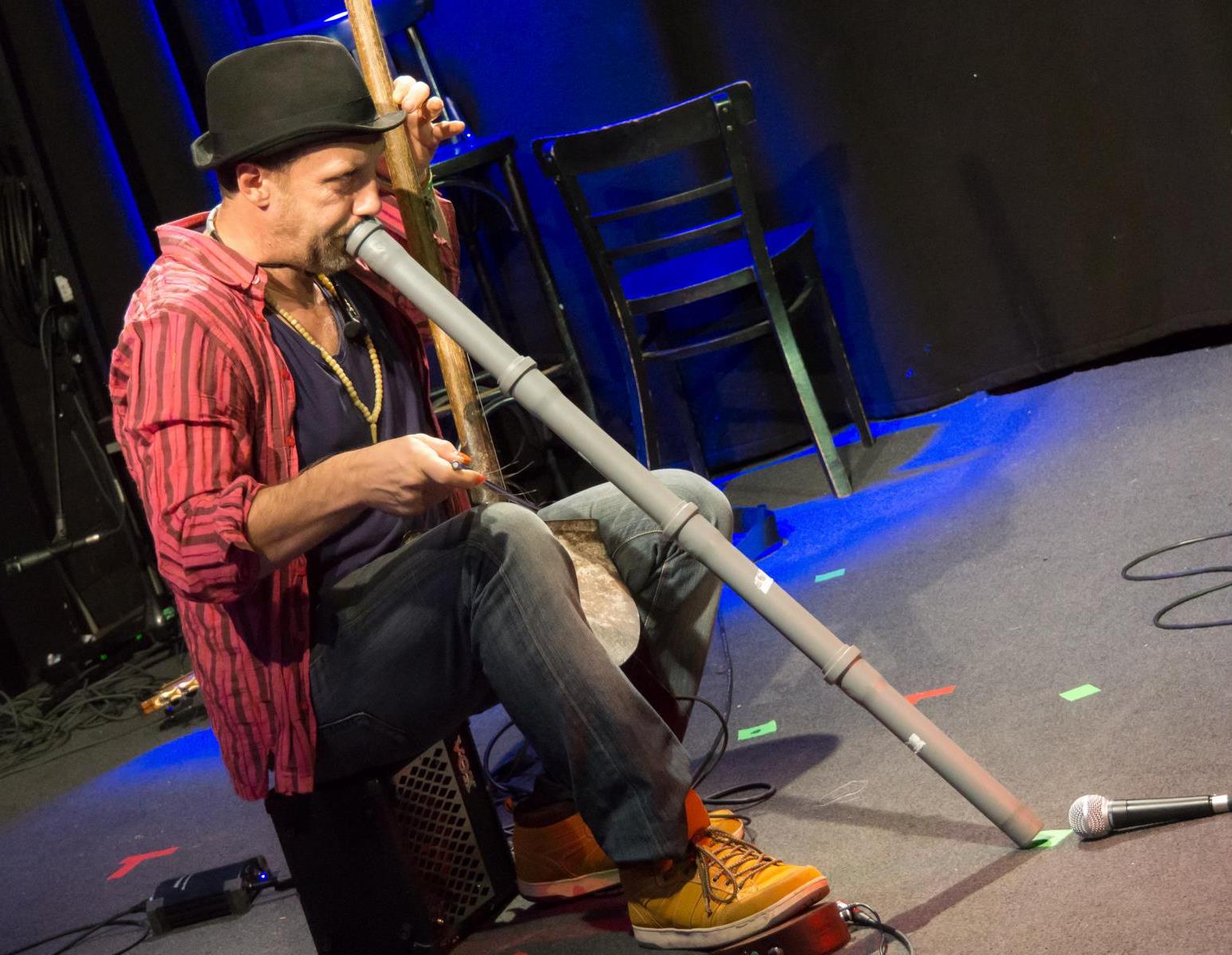 Michi Marchner macht aus allem Musik. In diesem Fall sind es ein Obi-AbflussRidgeridoo und eine indische Grabschaufel, die recht fernöstlich-sakrale Musik erklingen liessen.